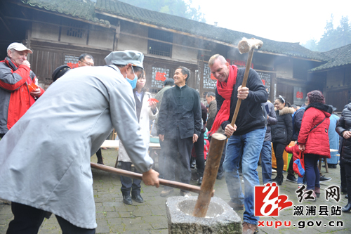位外国游客打糍粑。腊八节,当然少不了打糍粑。溆浦龙潭糍粑,又名年粑,是溆浦龙潭人民传统工艺美食。龙潭的水好土好气候好,种出的白丝糯和竹叶糯特别好。龙潭糯米打的粑,不用放糖都甜,或烤、或煮、或炸都是那样白嫩、柔和、清香,让人见了垂涎三尺。