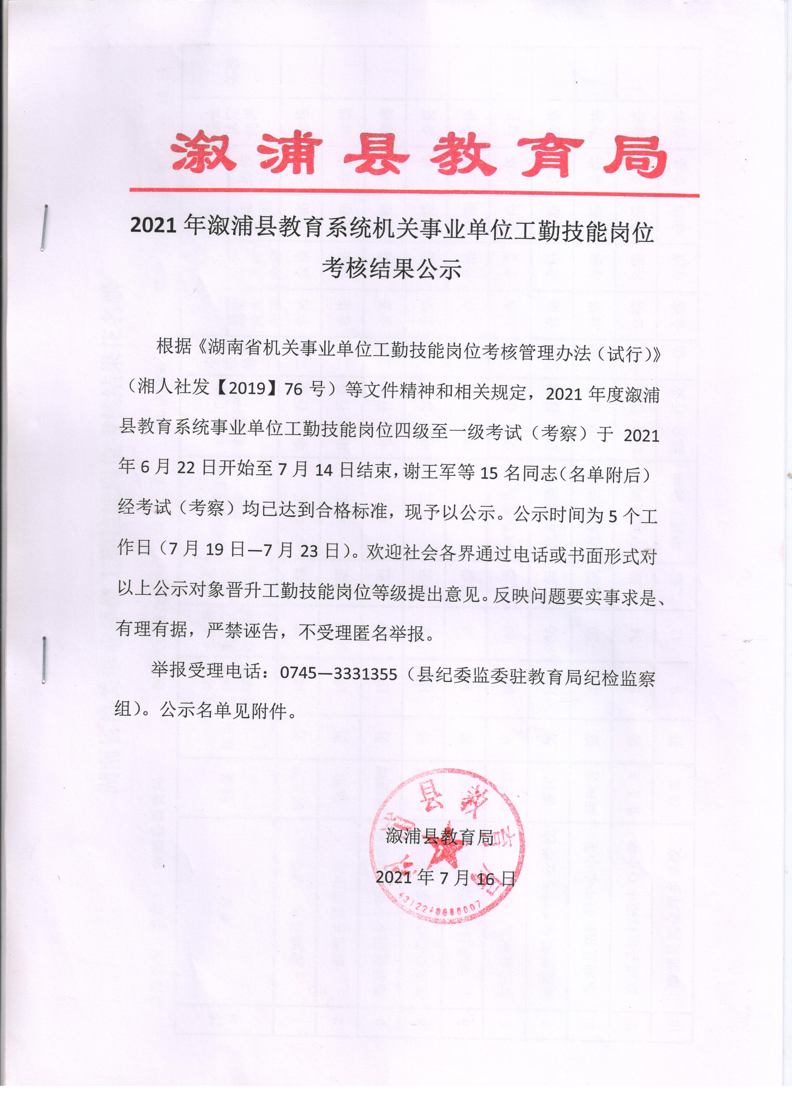 2021年溆浦县教育系统机关事业单位工勤技能岗位考核结果公示