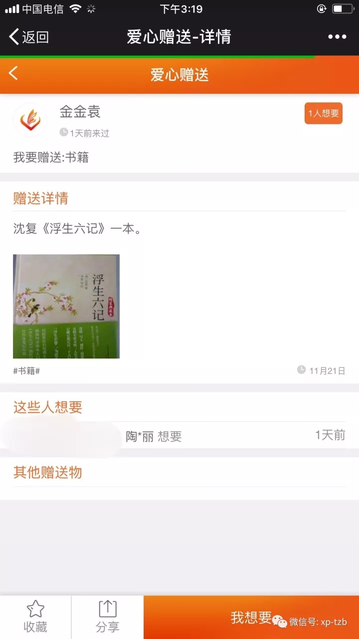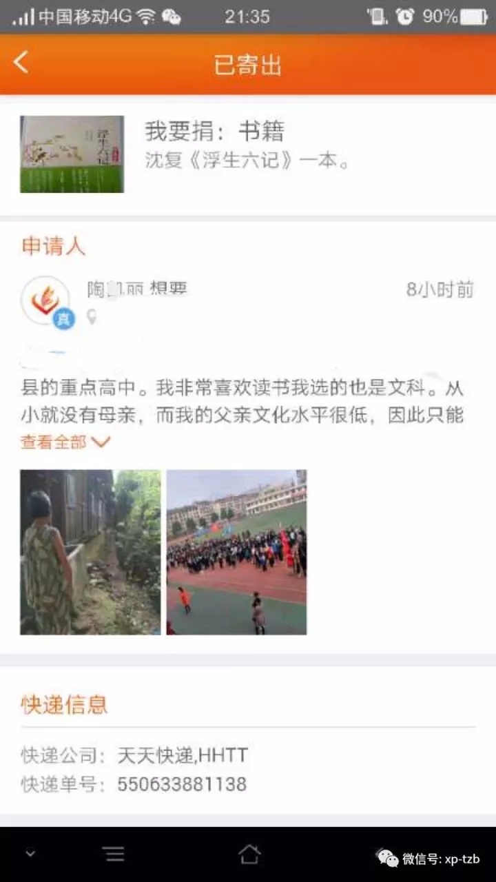 (袁珍珍发布的捐赠消息,发布在爱心广场没多久后就有了回应,一名贫困学生想要这本书)