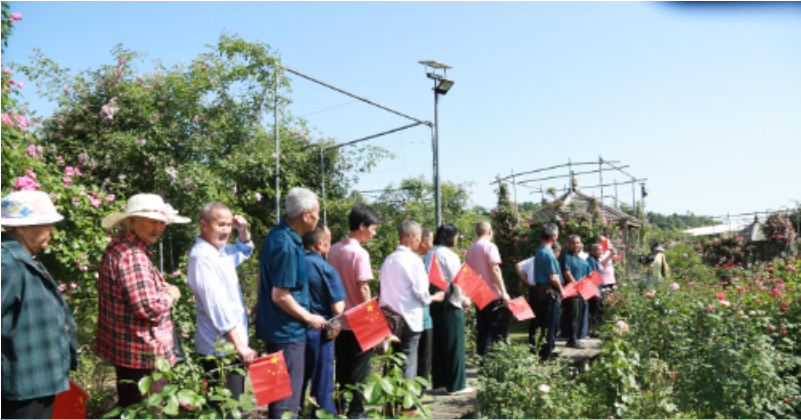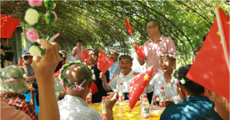 在趣味游戏环节中,老人们齐聚花树林荫下,伴随着音乐,热情洋溢地一边挥舞着小红旗,一边齐唱《没有共产党就没有新中国》,脸上挂满了愉快的笑容。