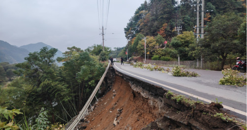 “村委会吗?大桥边公路护坎塌了,公路下面已经悬空。”11月11日凌晨6时30分,白竹坡村村民宋明义发现G241国道路基发生塌方,第一时间向村委会报告险情。