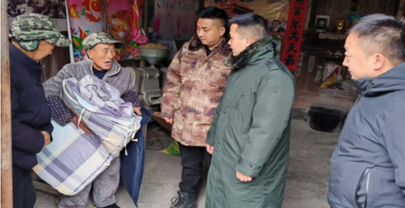 “敲门小队”为老人送上厚棉被、防寒服等御寒物资,并协助检查取暖设备、加固门窗,防止一氧化碳中毒和冻伤事故。走访中,工作人员发现五保户李远桂因水龙头冰冻无法用水,当即排查故障点,同步讲解防冻防滑知识,叮嘱“雨雪天少出门,有困难随时找村干部”。部分村还联合志愿者,在陡坡路段铺设防滑草帘,守护老人出行安全。