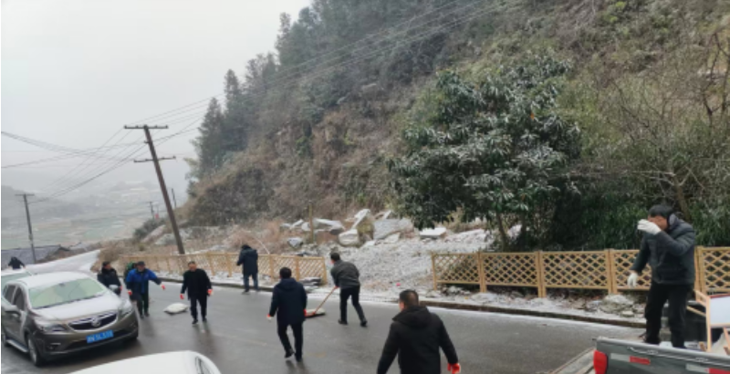 他们携带铁锹、工业盐等工具,重点攻坚桥梁、急弯陡坡等易结冰路段,顶着寒风均匀撒布融雪剂,加速冰层融化。行动中,村干部带头冲锋,分工协作抢在积雪压实前作业。中都乡应急小组清晨8点上路撒盐,筑牢“第一道防线”,在主干道抛洒工业盐,仅一上午就清理出安全通道。许多村民自发加入,与干部并肩作战,确保村内道路“雪停路净”。这场与时间赛跑的抢修,不仅打通了“出行生命线”,更让群众在寒冬中感受到温暖。