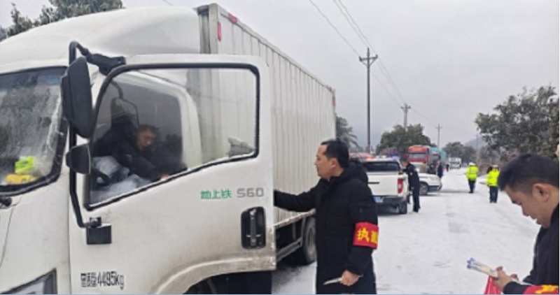近日,受本轮低温雨雪冰冻天气影响,G241国道黄茅园镇分水界路段路面出现结冰现象,导致多辆客货车滞留。面对险情,该镇第一时间启动应急响应机制,全力保障群众出行安全畅通。