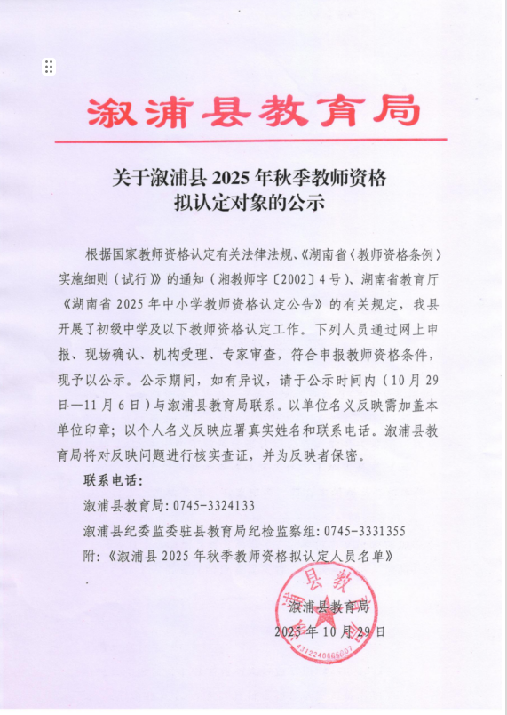 关于溆浦县2025年秋季教师资格拟认定对象的公示