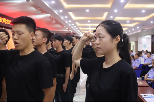 仪式上,21名新警面对警旗,高举右拳、目光坚定,庄严宣誓——“我是中国人民警察,我宣誓:坚决拥护中国共产党的绝对领导,矢志献身崇高的人民公安事业……”,誓词铿锵,慷慨激昂。