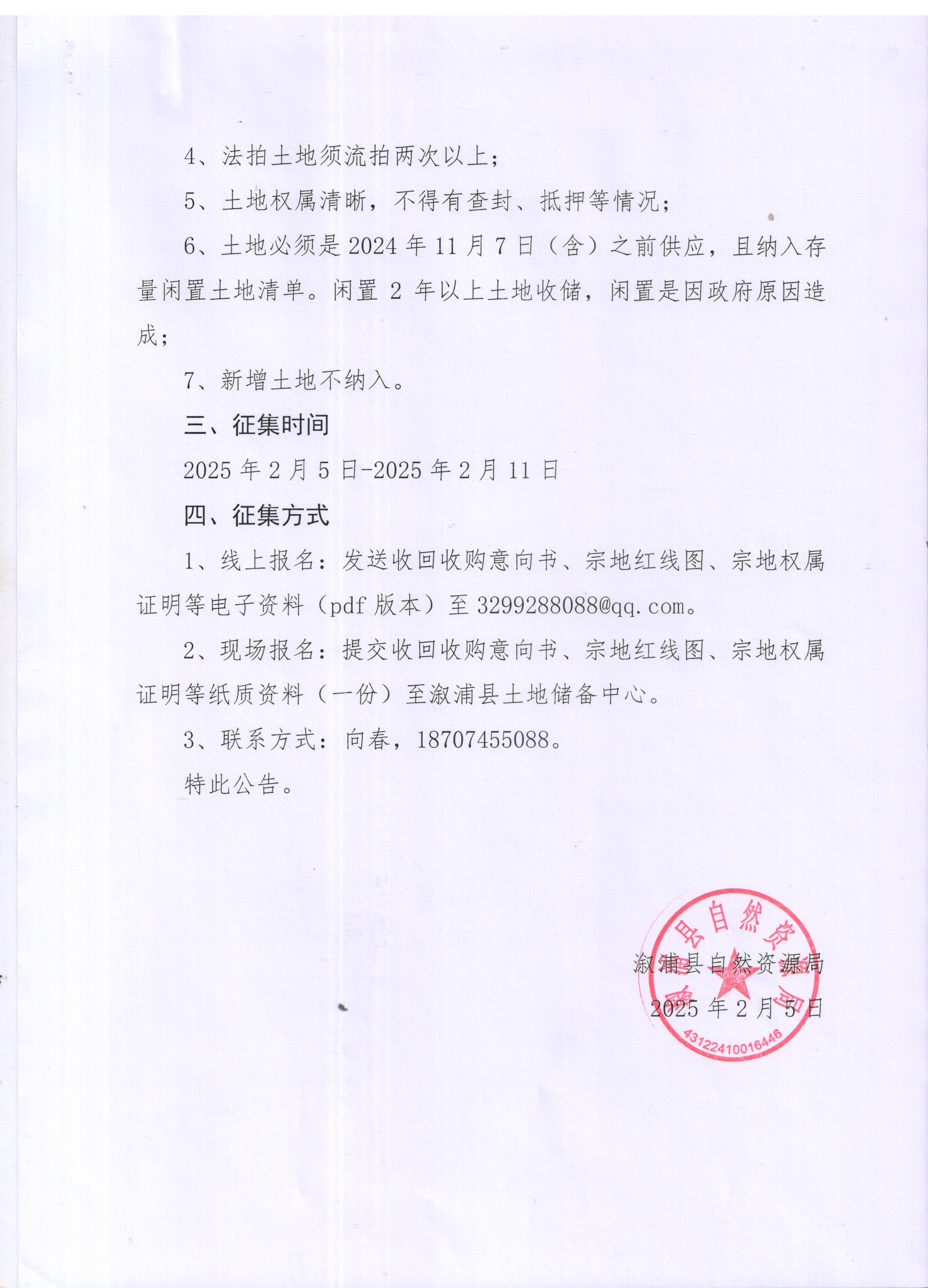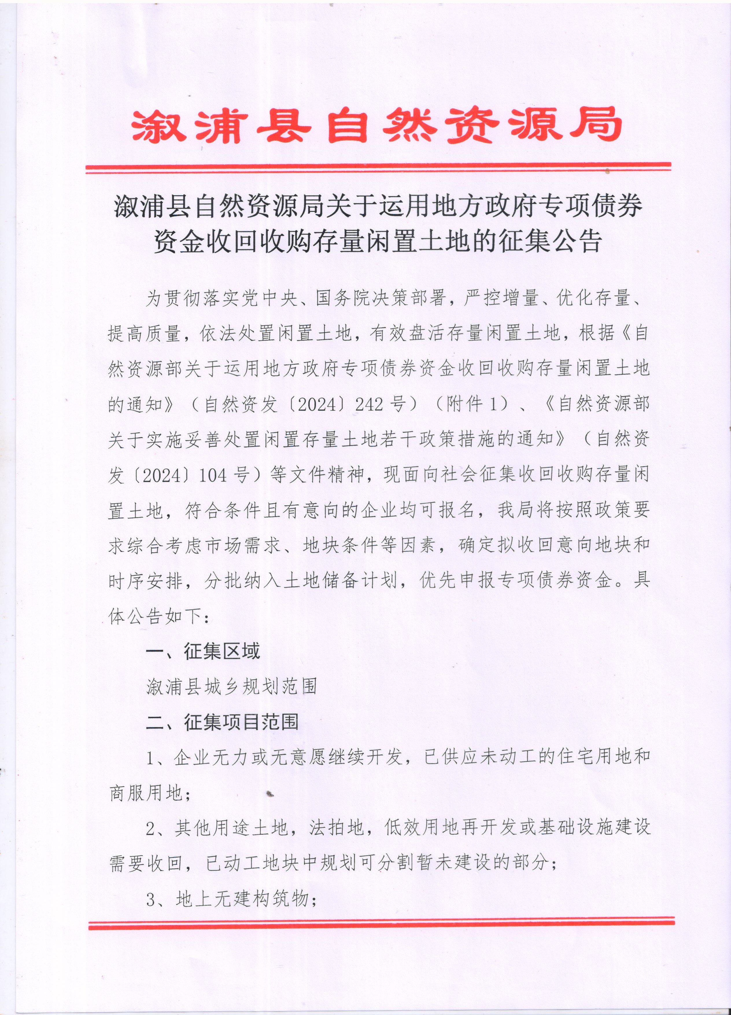 溆浦县自然资源局关于运用地方政府专项债券资金收回收购存量闲置土地的征集公告