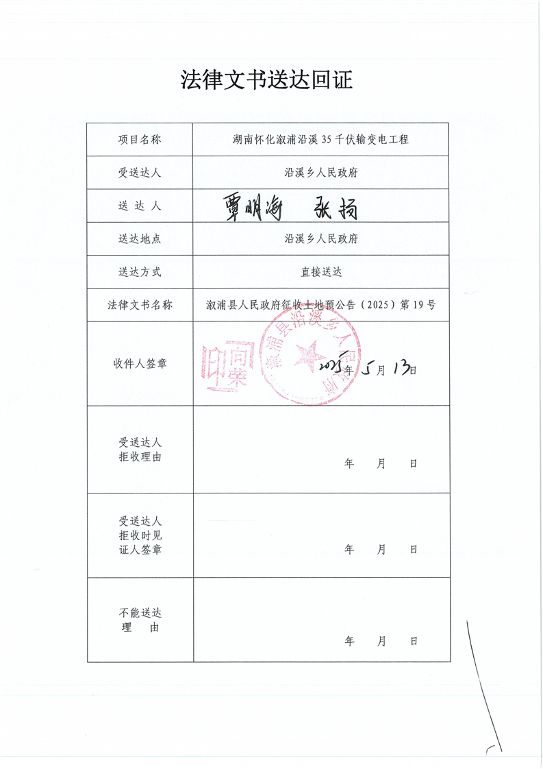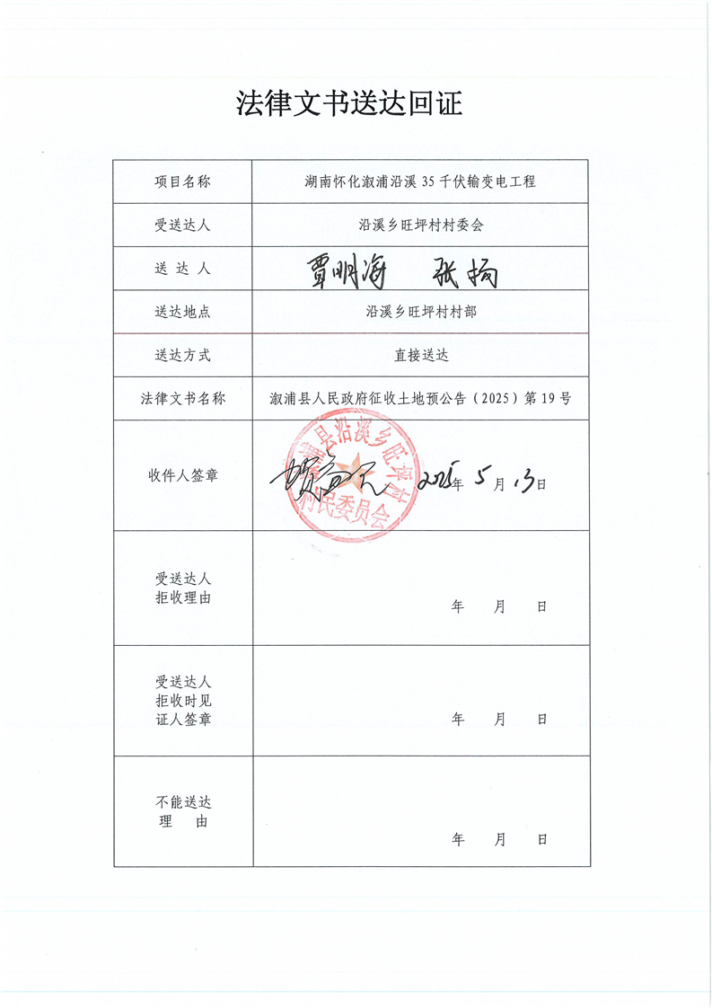 湖南怀化溆浦沿溪35千伏输电变电工程 拟征地公告及送达回证