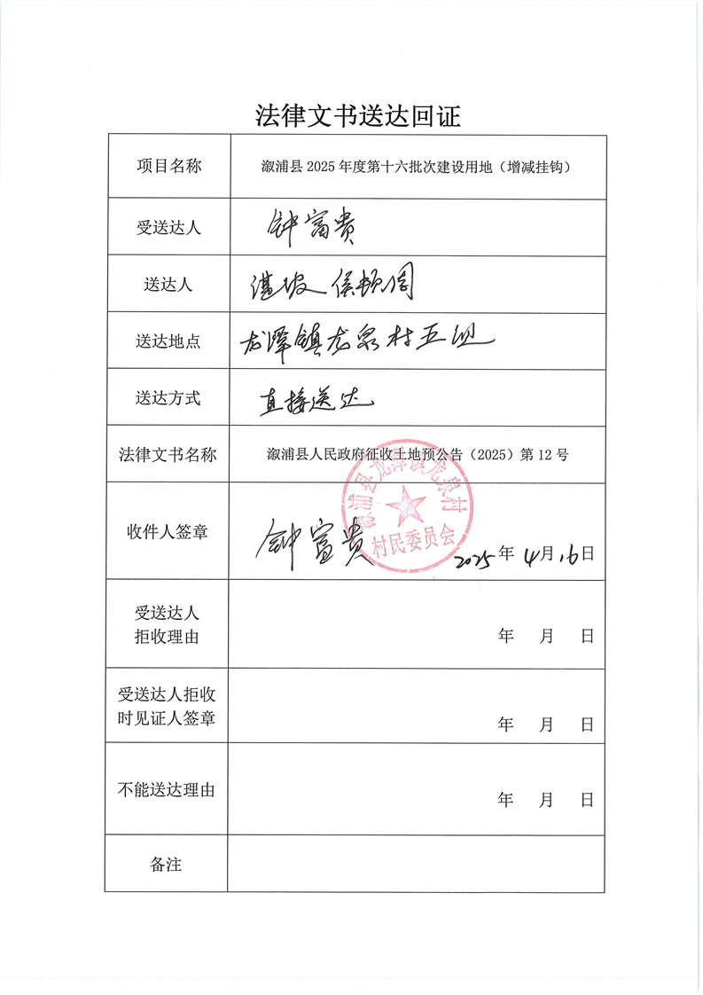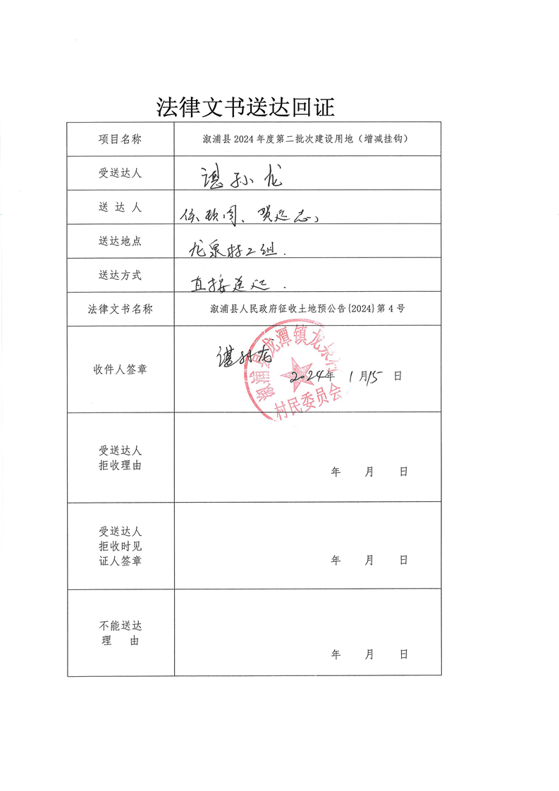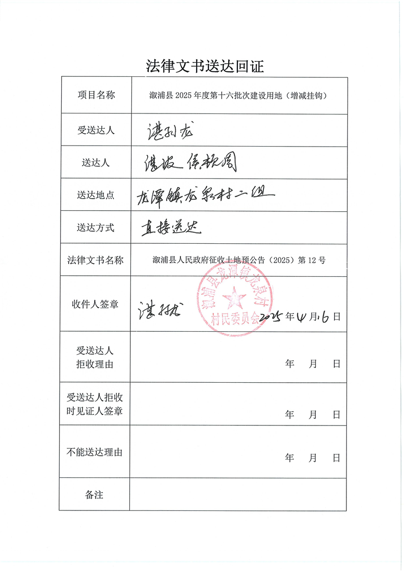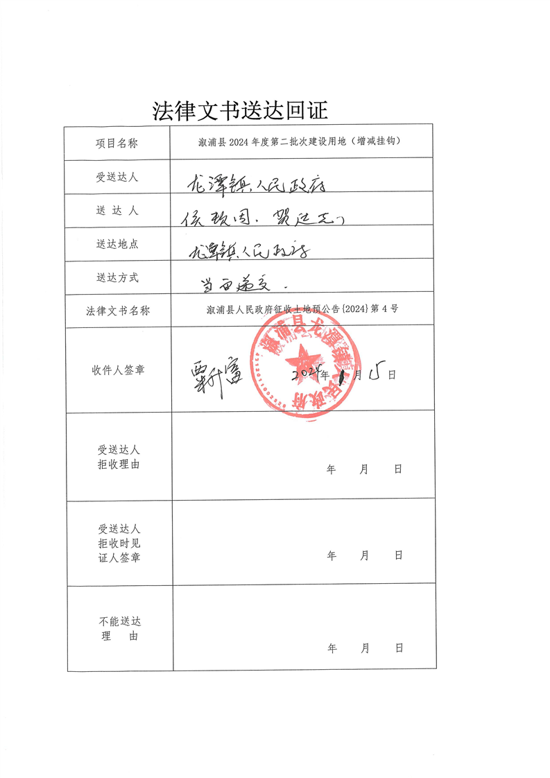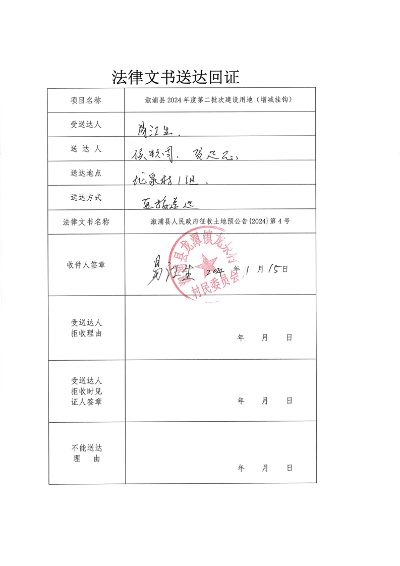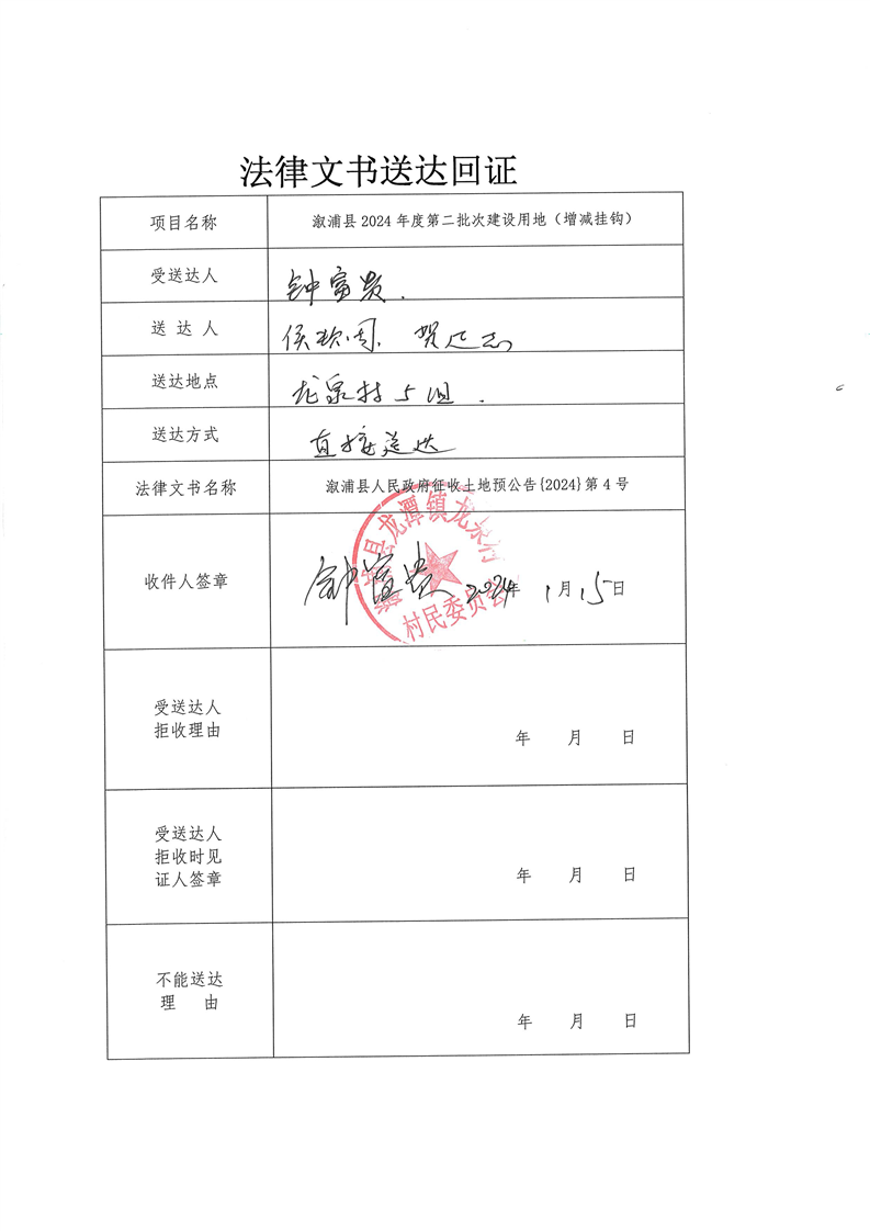 溆浦县2024年度第二批次建设用地(增减挂钩) 预公告及送达回证