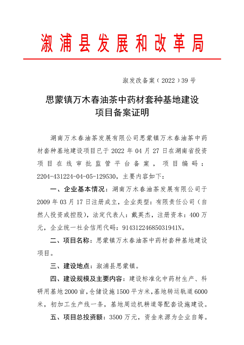 思蒙镇万木春油茶中药材套种基地建设项目。