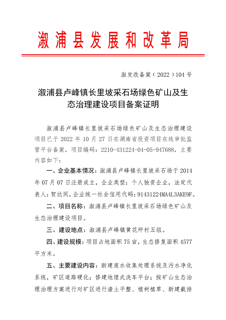 溆浦县卢峰镇长里坡采石场绿色矿山及生态治理建设项目