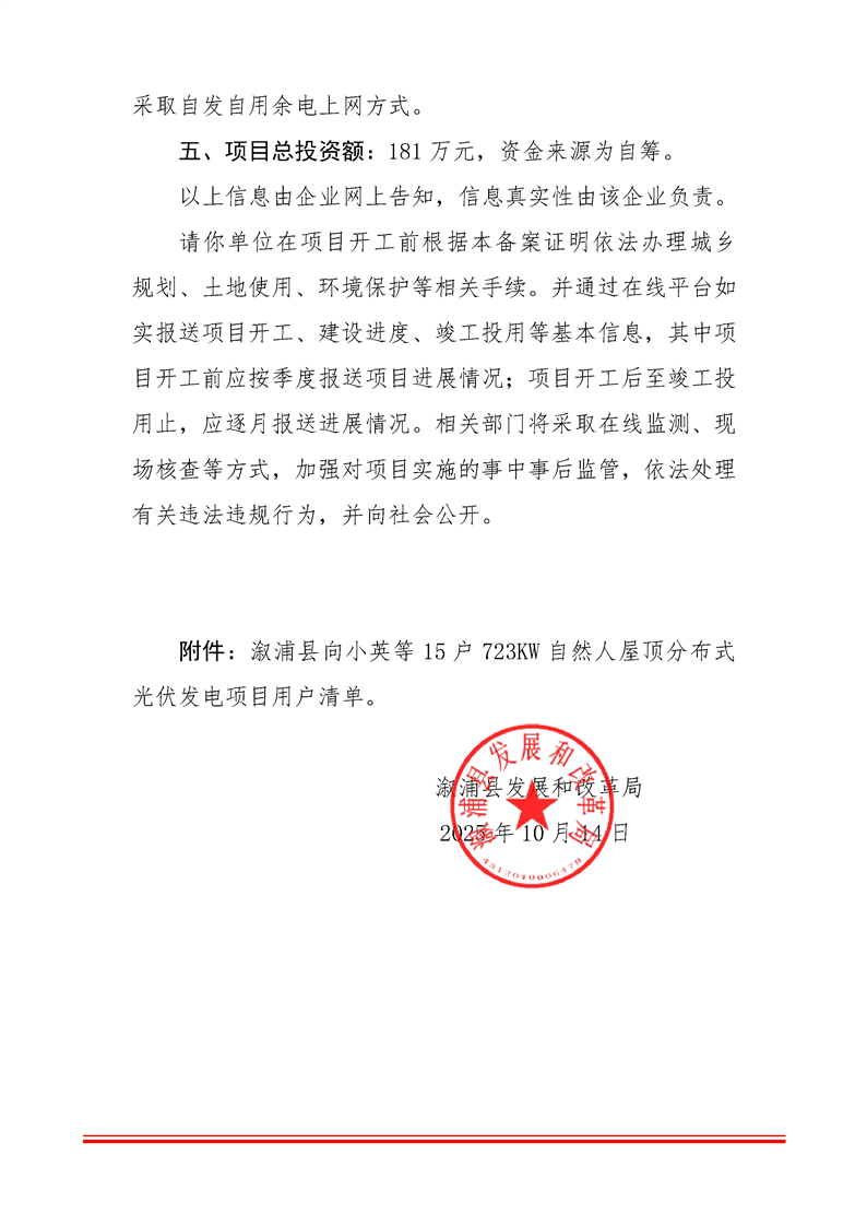溆浦县向小英等15户723KW自然人屋顶分布式光伏发电项目