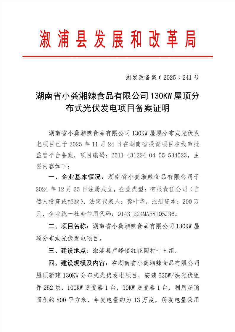湖南省小龚湘辣食品有限公司130KW屋顶分布式光伏发电项目