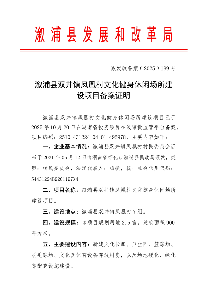 溆浦县双井镇凤凰村文化健身休闲场所建设项目备案证明