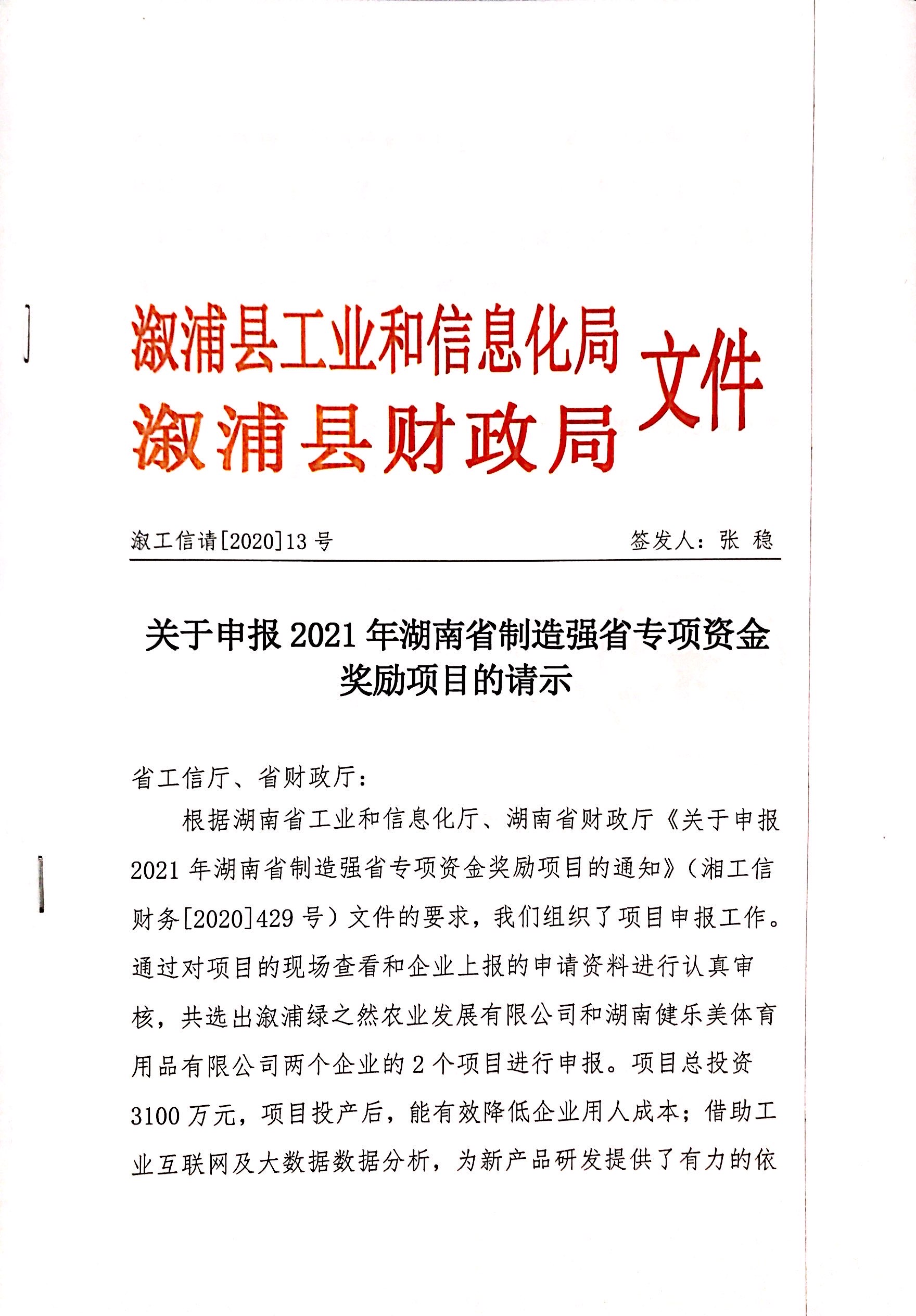 关于申报2021年湖南省制造强省专项资金奖励项目的请示