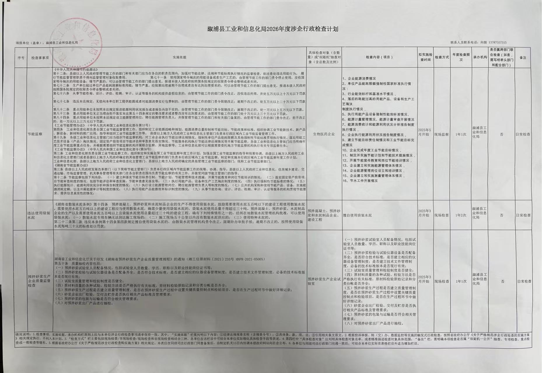 溆浦县工业和信息化局2026年度涉企行政检查计划