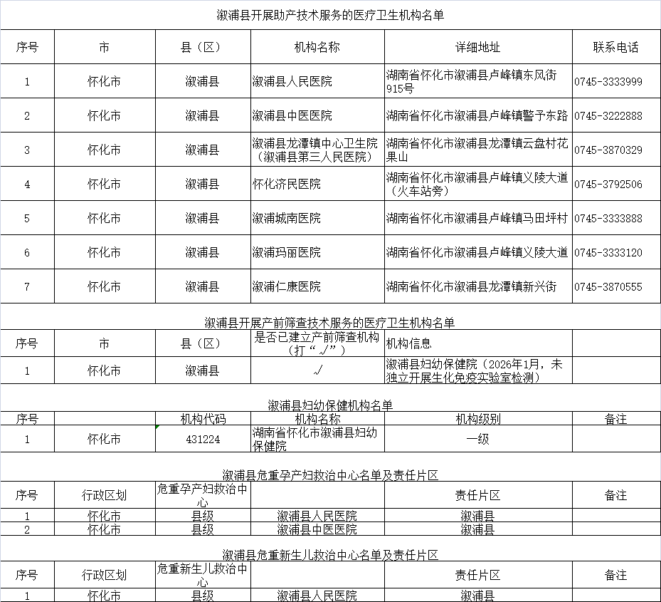 溆浦县开展母婴保健技术服务医疗机构名单