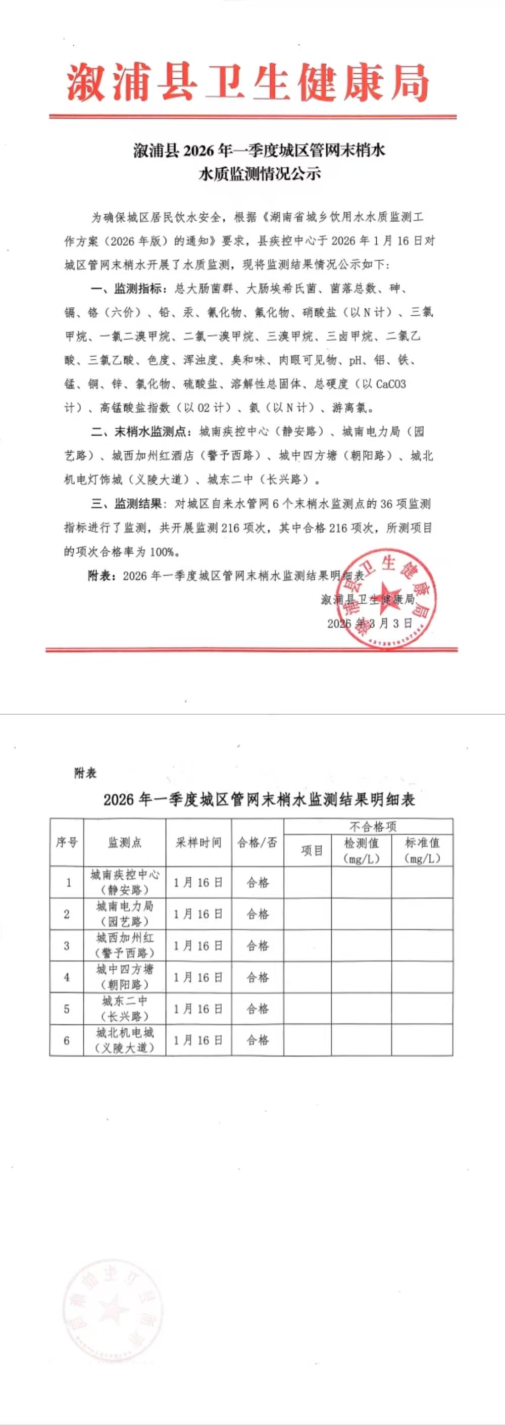 溆浦县2026年一季度城区管网末梢水水质监测情况公示
