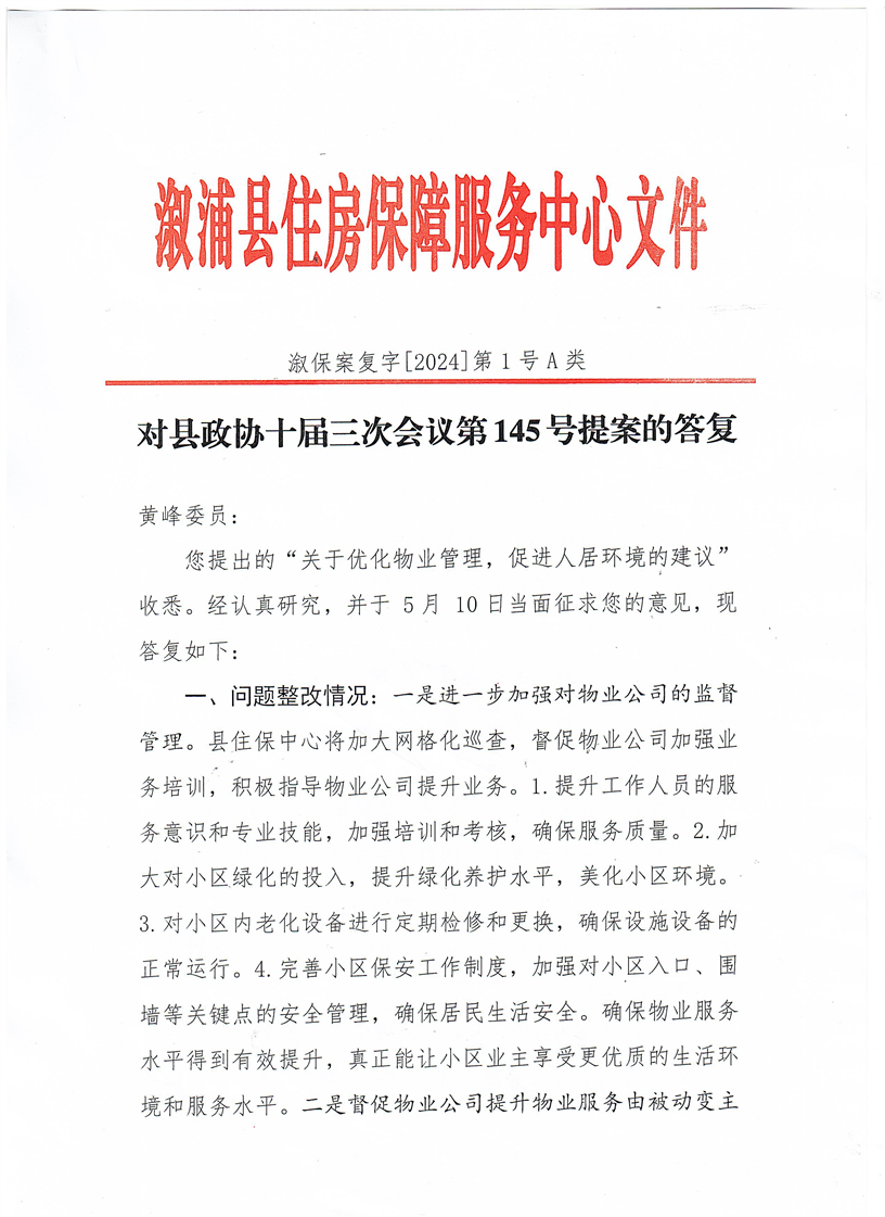 县政协十届三次会议第145号“关于优化物业管理,促使人居环境”的提案