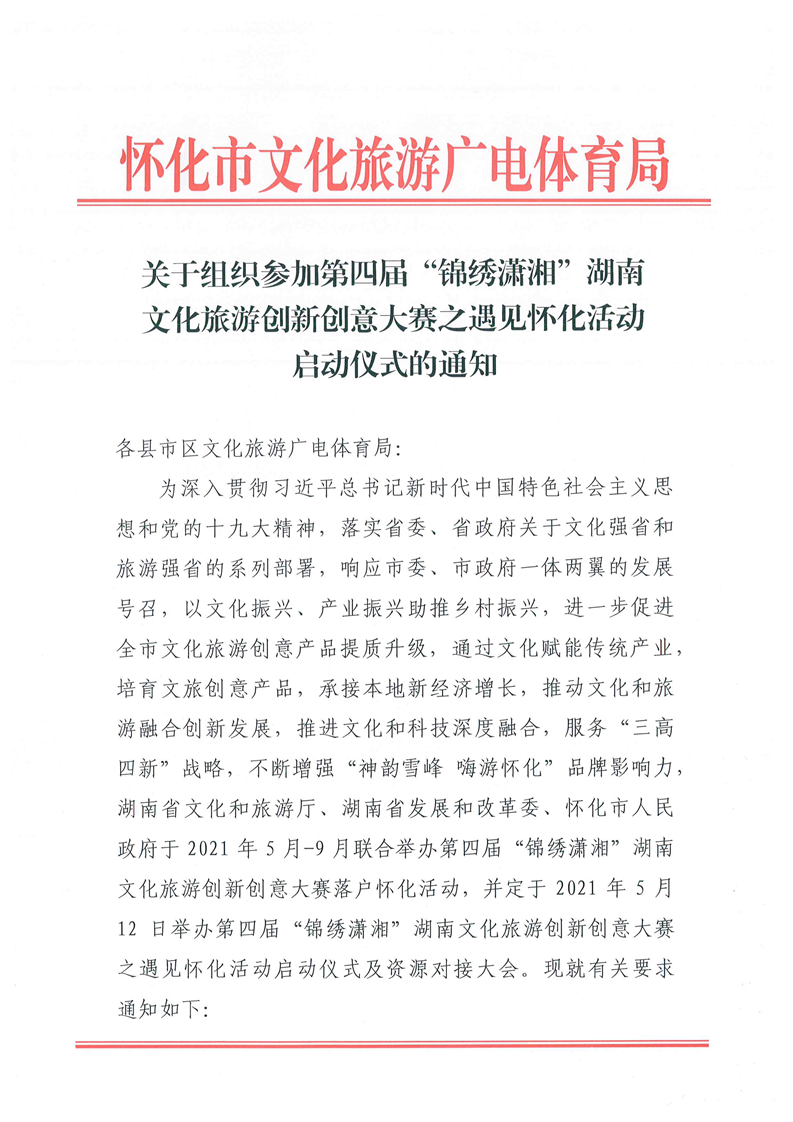 关于组织参加第四届“锦绣潇湘”湖南文化旅游创新创意大赛之遇见怀化活动启动仪式的通知