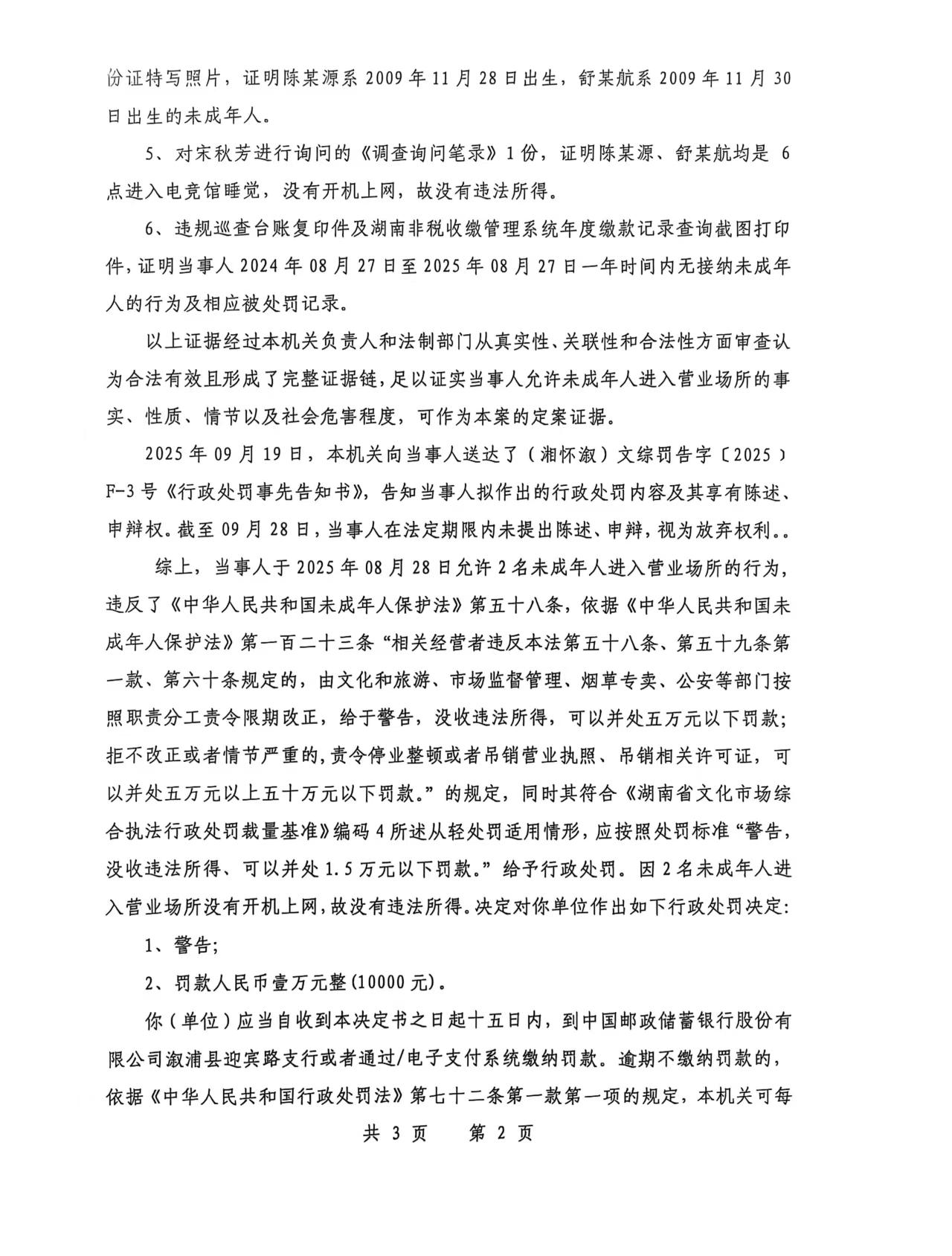 行政处罚决定书 -----溆浦县北极星电竞馆
