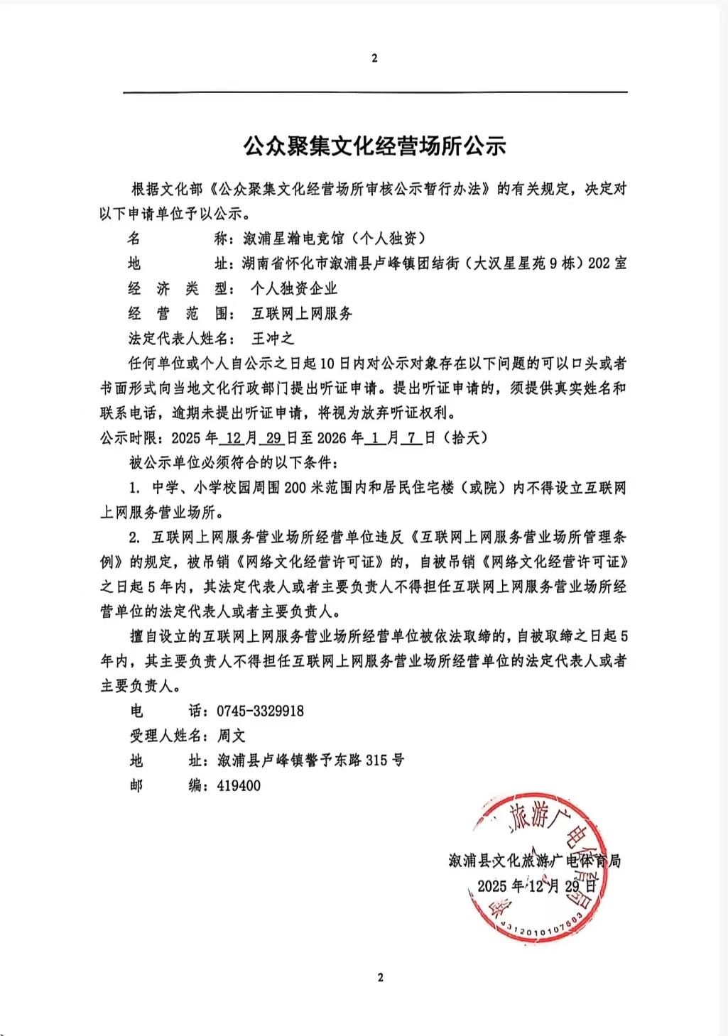 公众聚集文化经营场所公示-----溆浦星瀭电竞馆(个人独资)