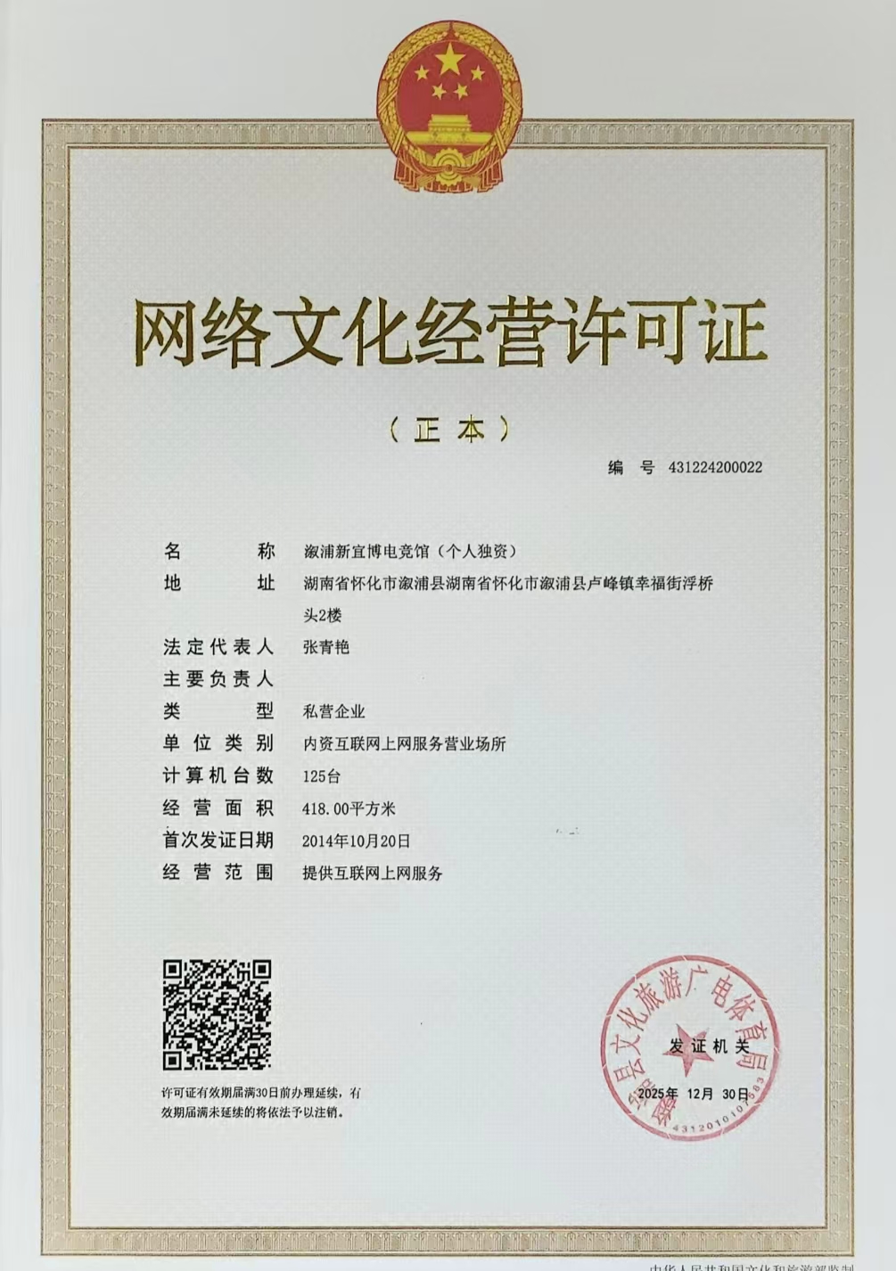 溆浦新宜博电竞馆(个人独资)网络文化经营许可证-更换法人