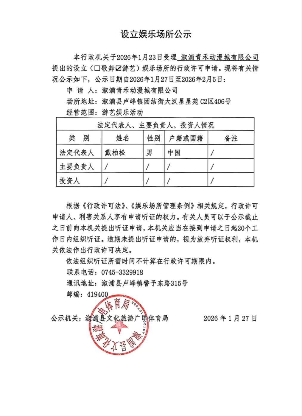 设立娱乐场所公示-----溆浦青禾动漫城有限公司
