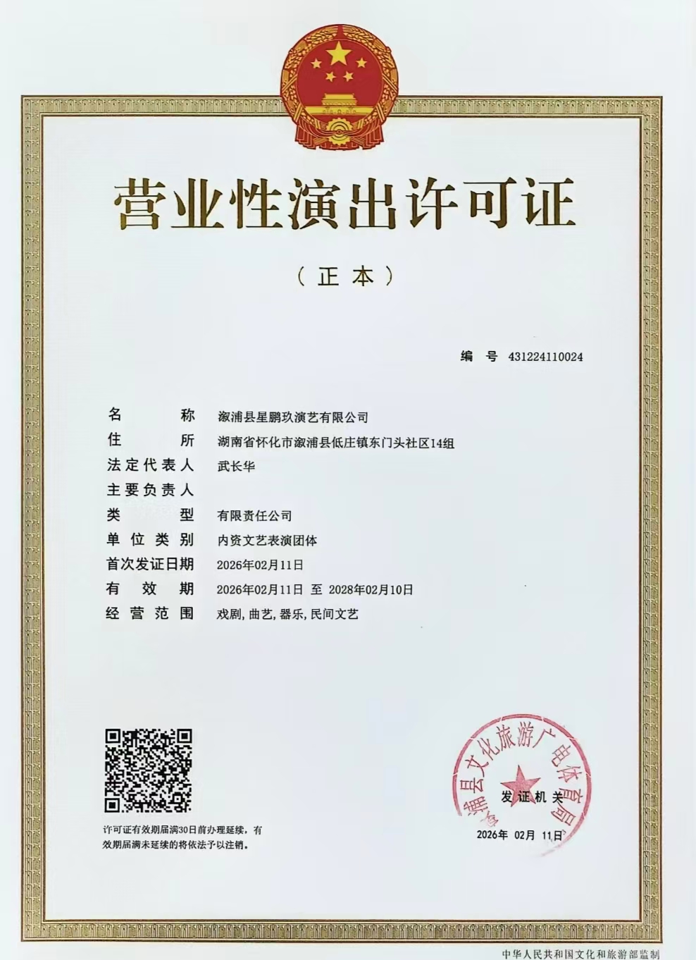 娱乐经营许可证----溆浦星鹏玖演艺有限公司