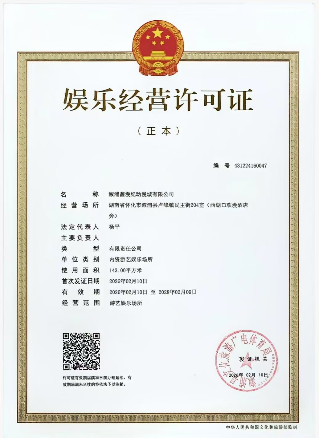 娱乐经营许可证----溆浦鑫漫纪动漫城有限公司