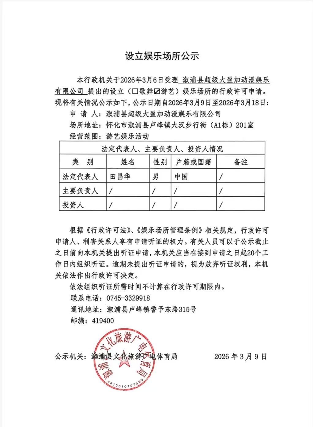 设立娱乐场所公示-----溆浦县超级大盈加动漫娱乐有限公司