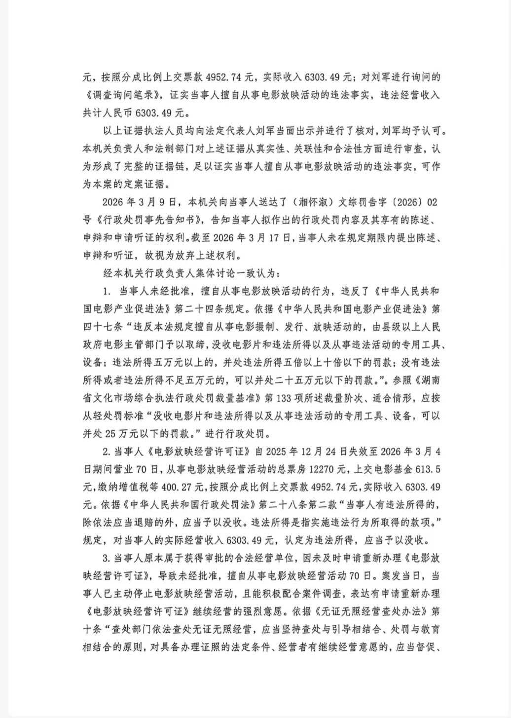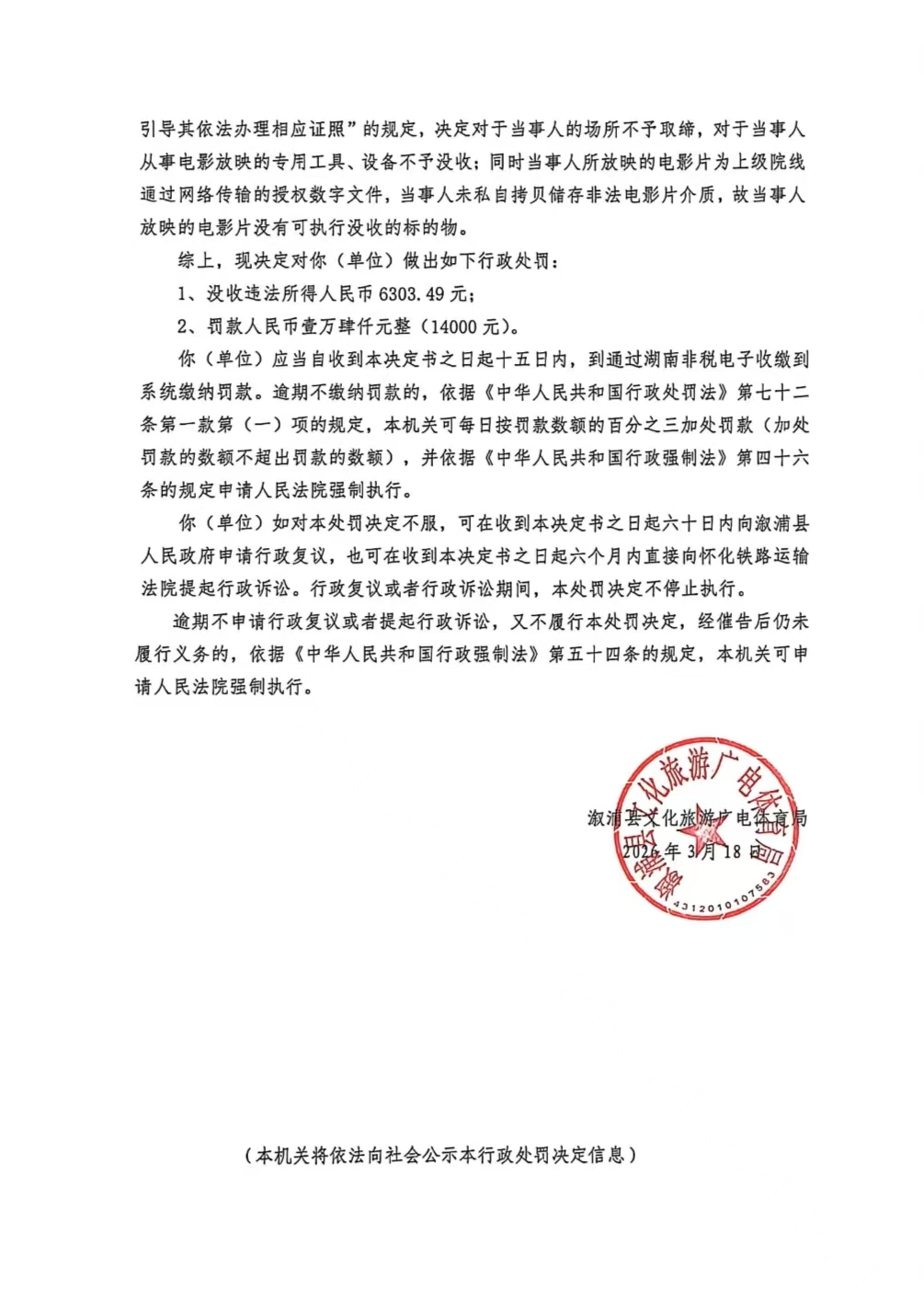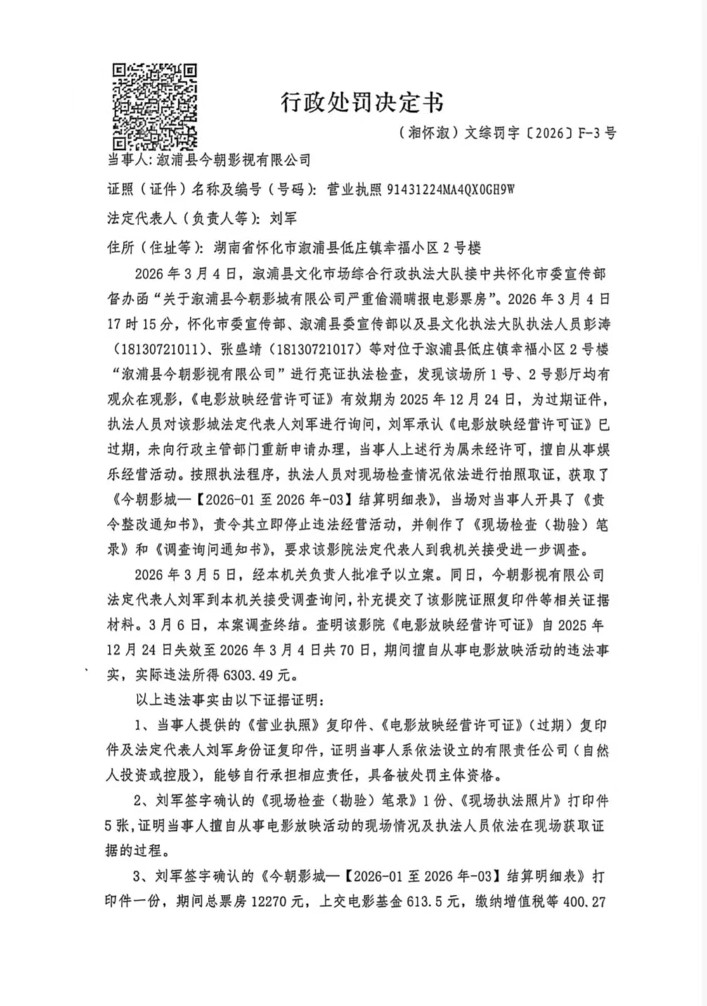 行政处罚决定书--溆浦县今朝影视有限公司(湘怀溆)文综罚字 〔2026〕F-3号