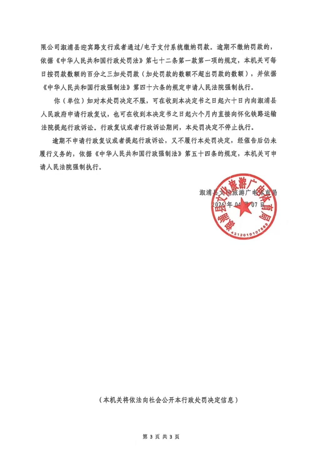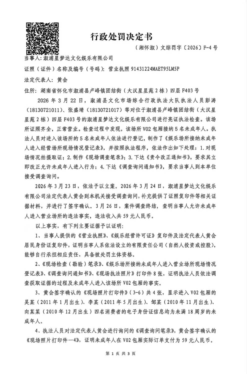 行政处罚决定书--溆浦县星梦达文化娱乐有限责任公司(湘怀溆)文综罚字 〔2026〕F-4号