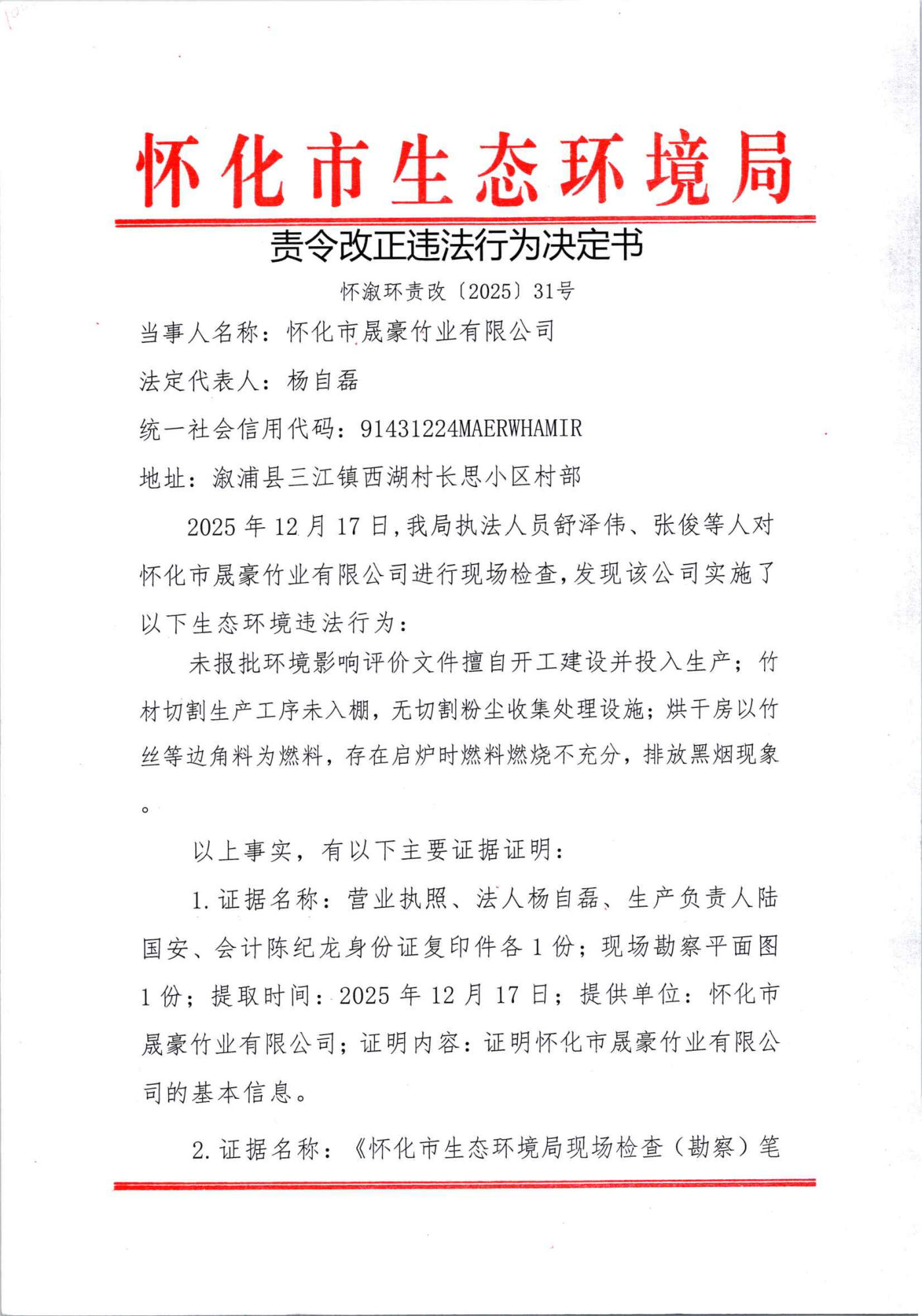 怀化市晟豪竹业有限公司:违反《中华人民共和国环境影响评价法》责令改正违法行为决定书