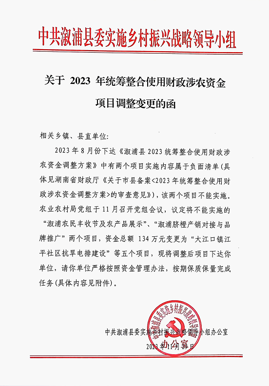 关于〈溆浦县2023统筹整合使用财政涉农资金调整方案〉项目变更的公示