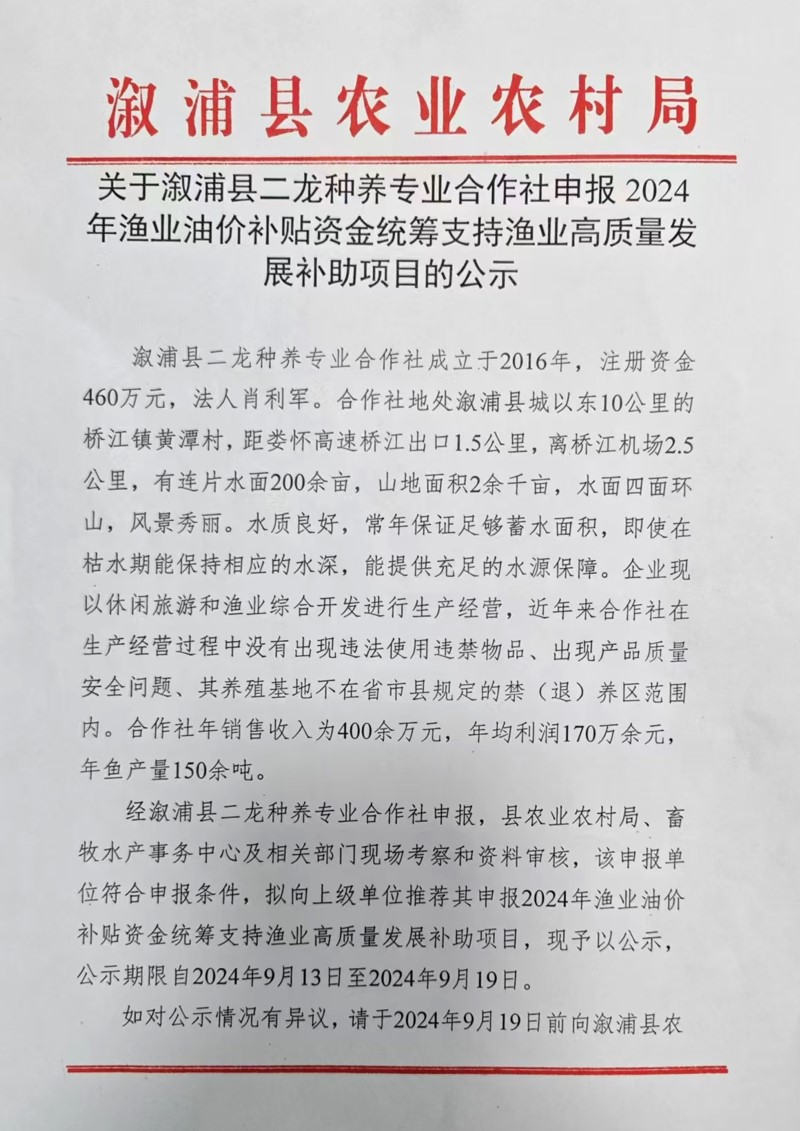 关于溆浦县二龙种养专业合作社申报2024年渔业油价补贴资金统筹支持渔业高质量发展补助项目的公示