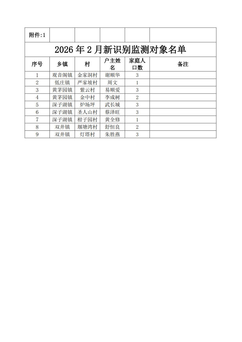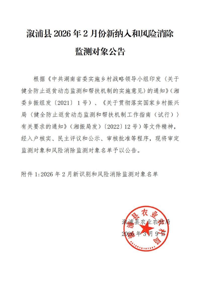 溆浦县2026年2月份新纳入和风险消除监测对象公告