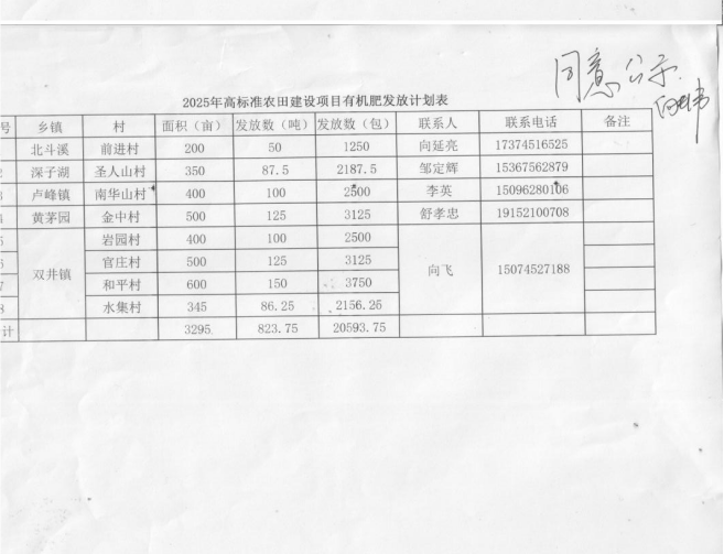 依据怀化市农业农村局《关于溆浦县2025年度高标准农田建设初步设计的批复》(怀农发【2025】22、23号)文件精神,以种植粮食作物为重点,通过免费发放有机肥改良土壤,增加土壤有机质,减少化肥用量,改善环境,促进粮食稳定增产、农业提质增效、农民节本增收,现对“溆浦县2025年高标准农田建设项目有机肥发放计划表”予以公示,请广大农民群众监督,提出宝贵意见。