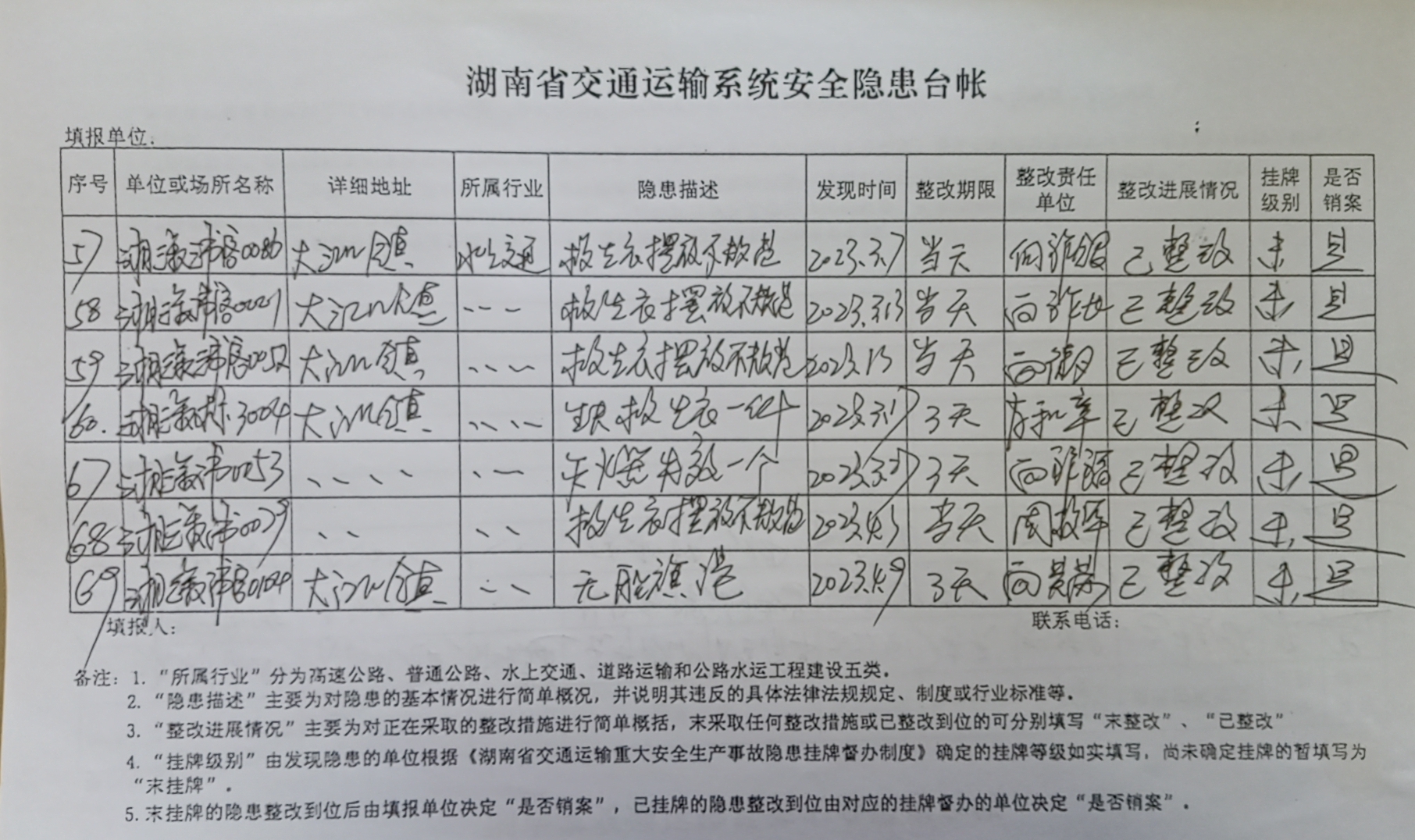 溆浦水运事务中心2023年3至4月安全隐患台账