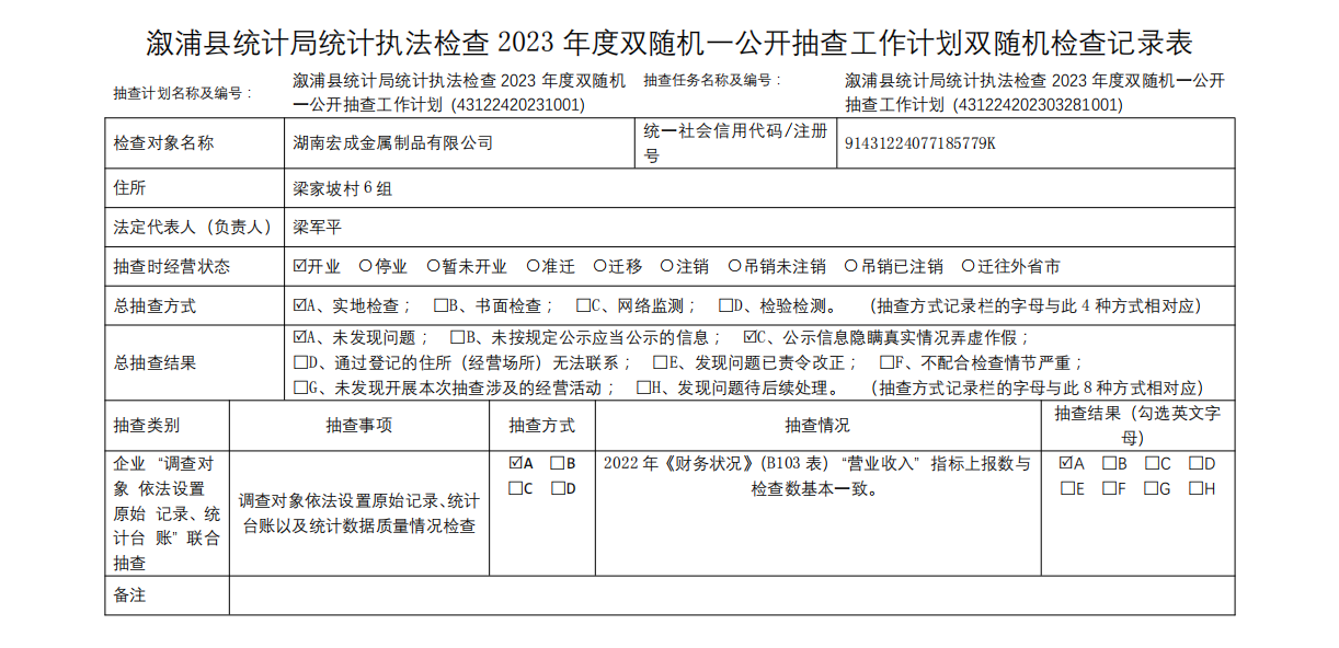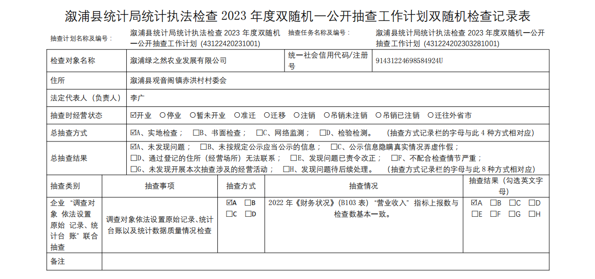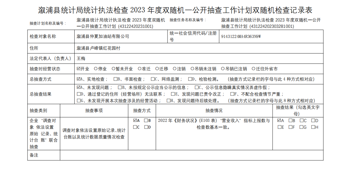 溆浦县统计局统计执法检查2023年度“双随机、一公开”抽查工作计划双随机检查记录表1