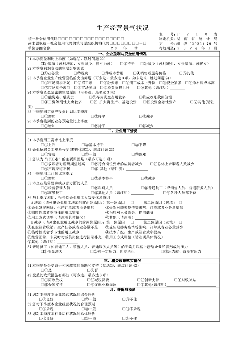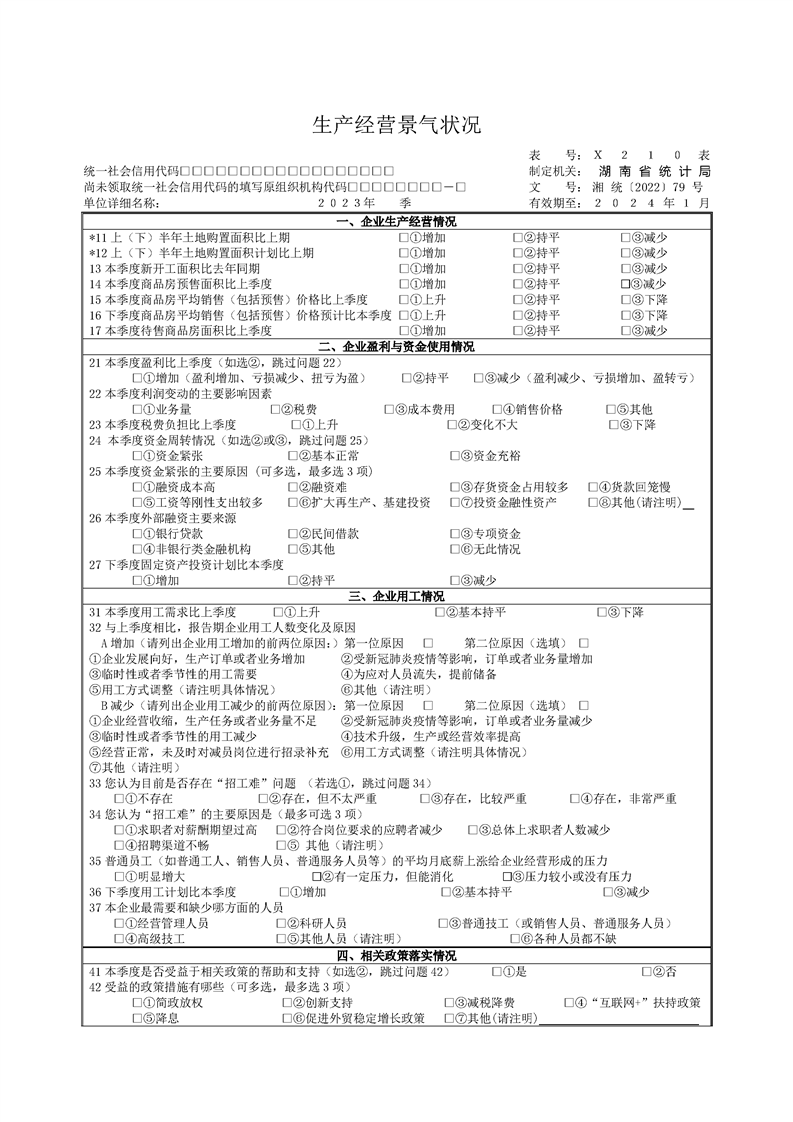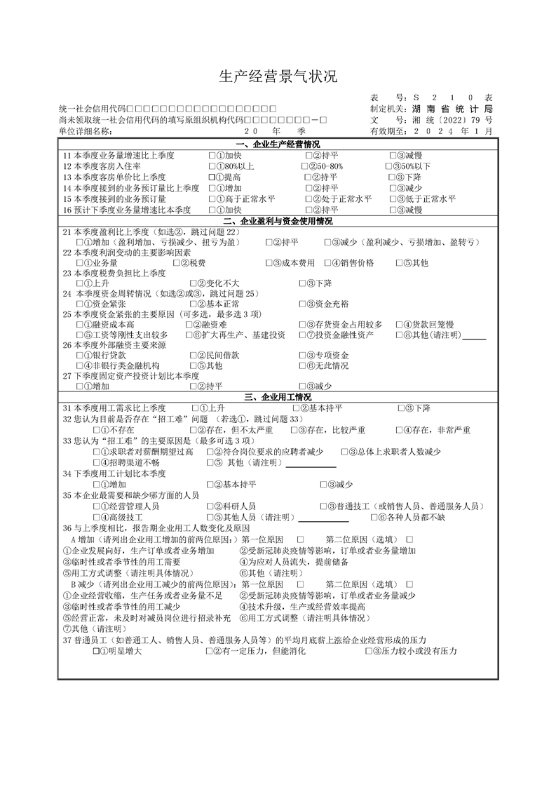 湖南省生产经营景气状况调查报表制度(2023 年定期报表)