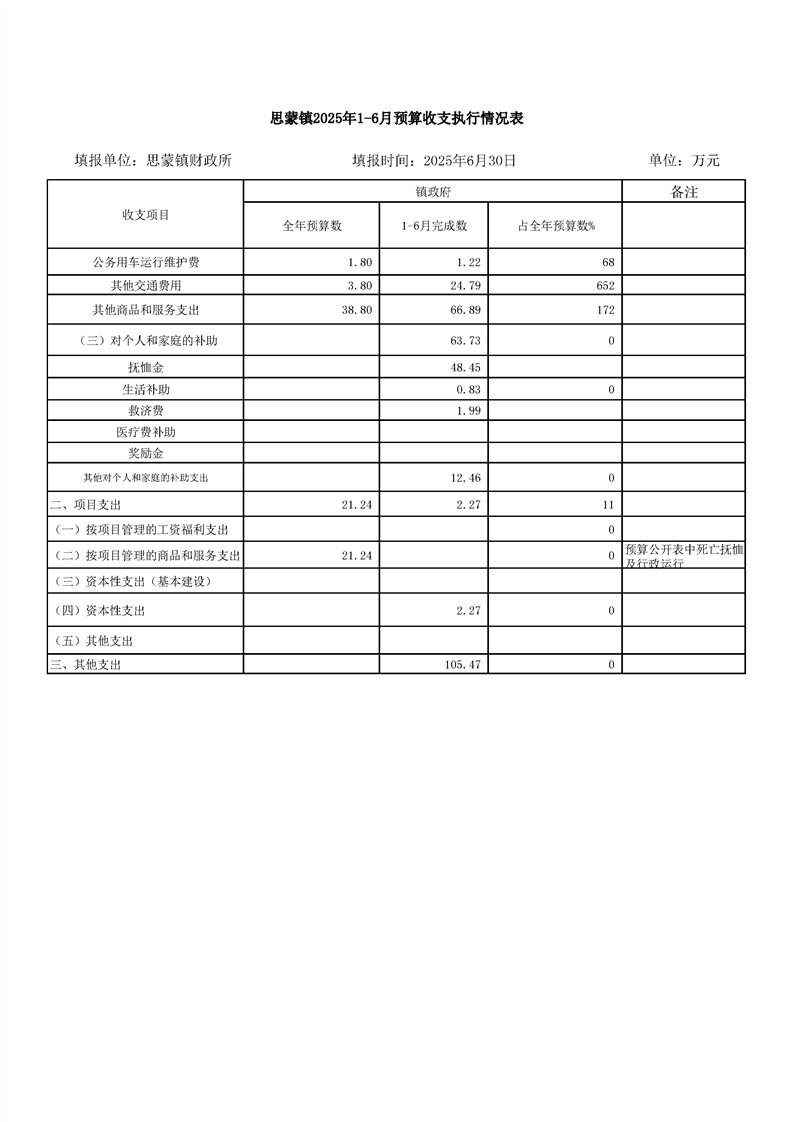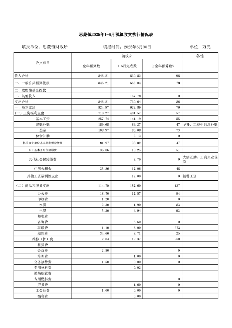 思蒙镇人民政府2025年1-6月预算执行情况分析表
