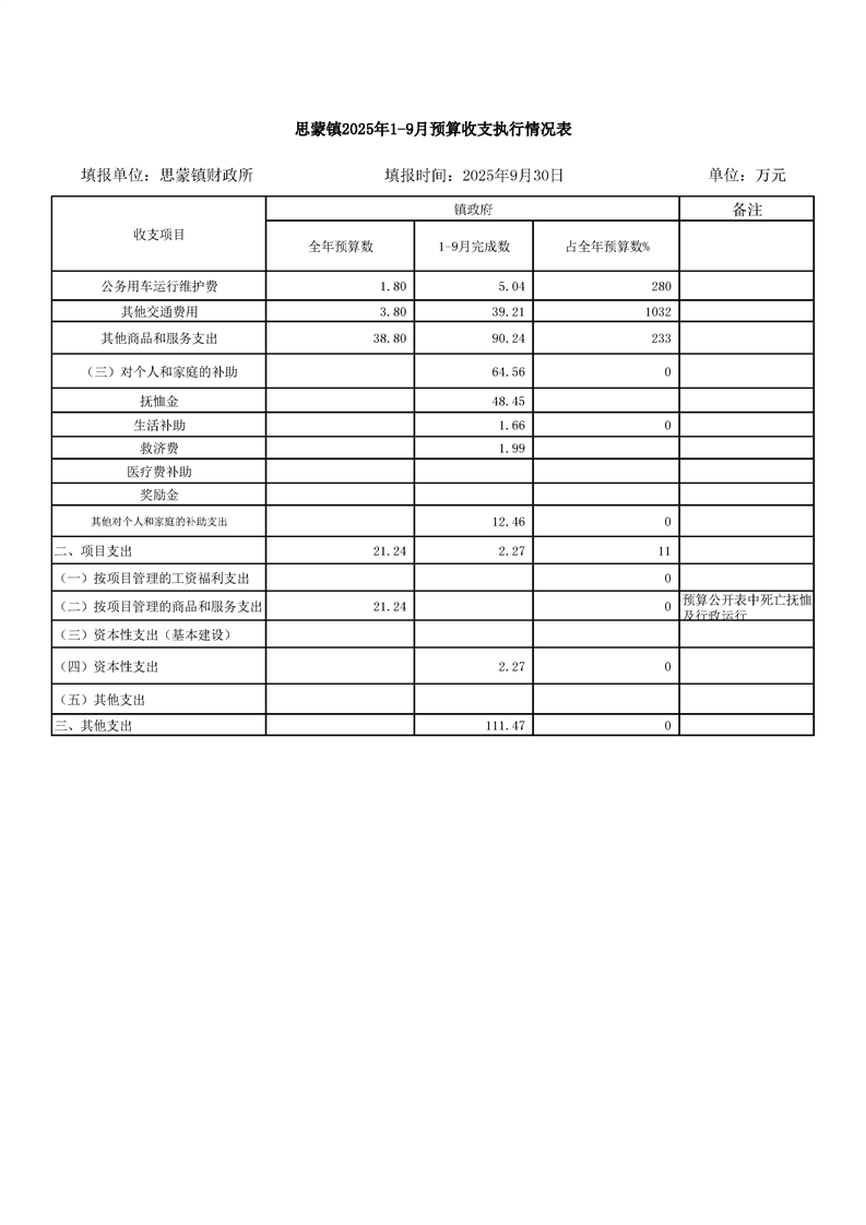 思蒙镇人民政府2025年1-9月预算执行情况分析表
