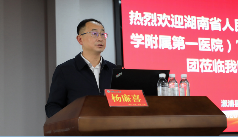 杨廉喜代表县委、县政府对省人民医院专家一行的到来表示热烈欢迎,对其长期以来对溆浦医疗卫生事业的关心支持致以崇高敬意和衷心感谢。他指出,省人民医院作为全省医疗卫生系统的“排头兵”,此次送教上门既是优质医疗资源下沉的生动实践,更为溆浦卫生健康事业高质量发展注入了强劲动力。杨廉喜强调,医疗卫生是最大的民生工程,也是推动县域经济社会高质量发展的重要支撑。当前溆浦正全力构建优质高效的医疗卫生服务体系,让群众在家门口享受优质医疗服务。他希望全县医务工作者珍惜此次学习机会,认真领悟专家们的高超医术、先进管理经验和崇高职业精神,切实把学习成果转化为提升服务能力、推动工作的实际成效。同时,恳请省人民医院的专家能继续关心、支持溆浦的发展,在学科建设、人才培养、医院管理等方面给予更多指导与帮助,助力溆浦医疗卫生事业实现更高质量、更高水平的发展。