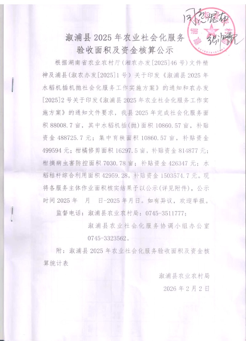 溆浦县2025年农业社会化服务验收面积及资金核算公示