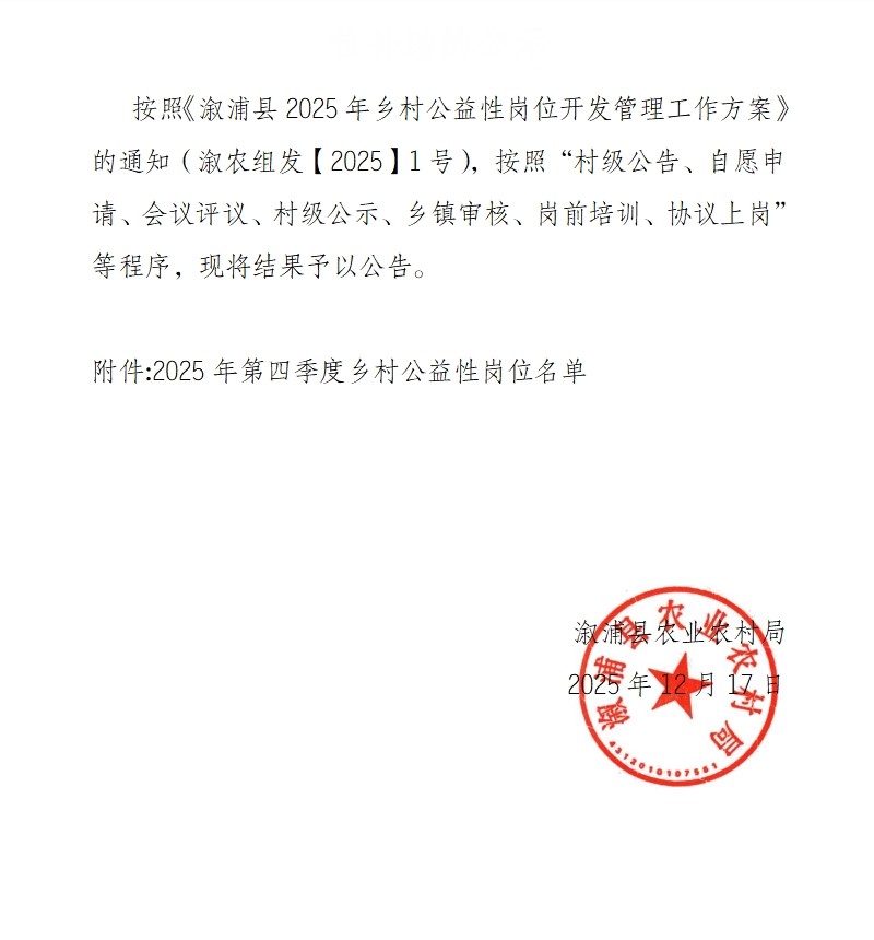 关于溆浦县2025年第四季度乡村公益性岗位补助的公示