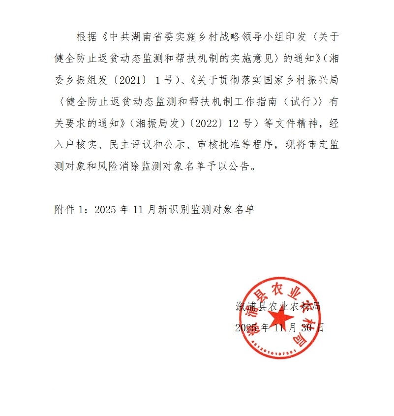 溆浦县2025年11月份新纳入和风险消除监测对象公告