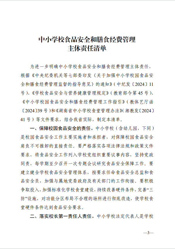 湖南省教育厅关于印发《中小学校食品安全和膳食经费管理主体责任清单》的通知