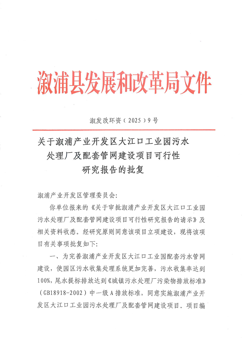 关于溆浦产业开发区大江口工业园污水处理厂及配套管网建设项目可行性研究报告的批复