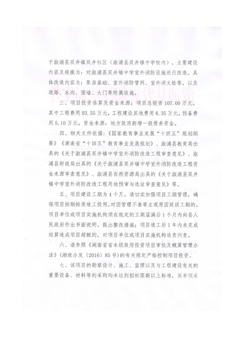 关于溆浦县双井镇中学室外消防改造工程可行性研究报告的批复